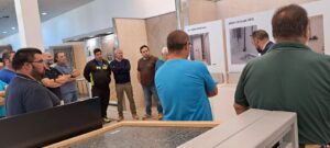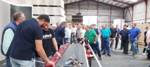 A última hora de la mañana disfrutamos de una demostración del corte, colocación y pegado de los grandes formatos, por parte del personal de Butech. Los profesionales que se animaron pudieron probar ellos mismos a cortar estos materiales.
