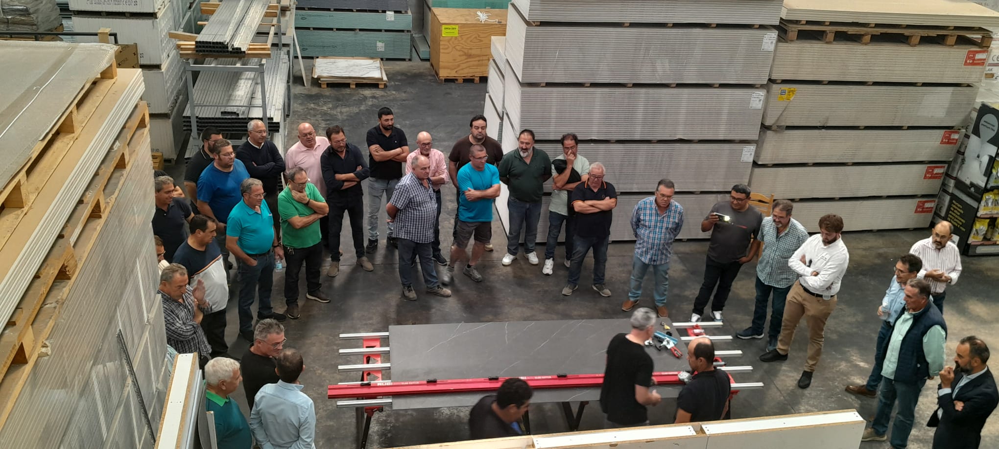 A última hora de la mañana disfrutamos de una demostración del corte, colocación y pegado de los grandes formatos, por parte del personal de Butech. Los profesionales que se animaron pudieron probar ellos mismos a cortar estos materiales.